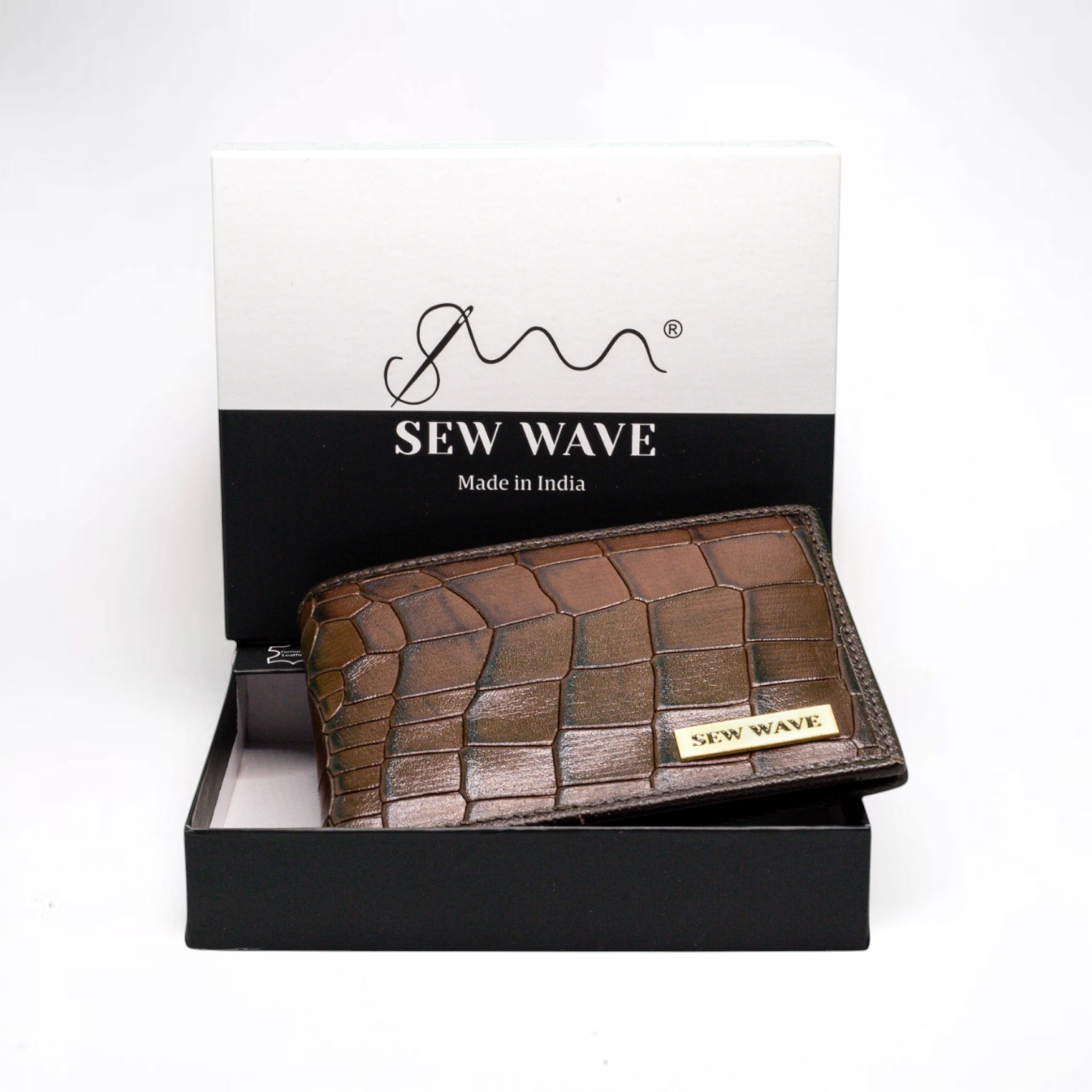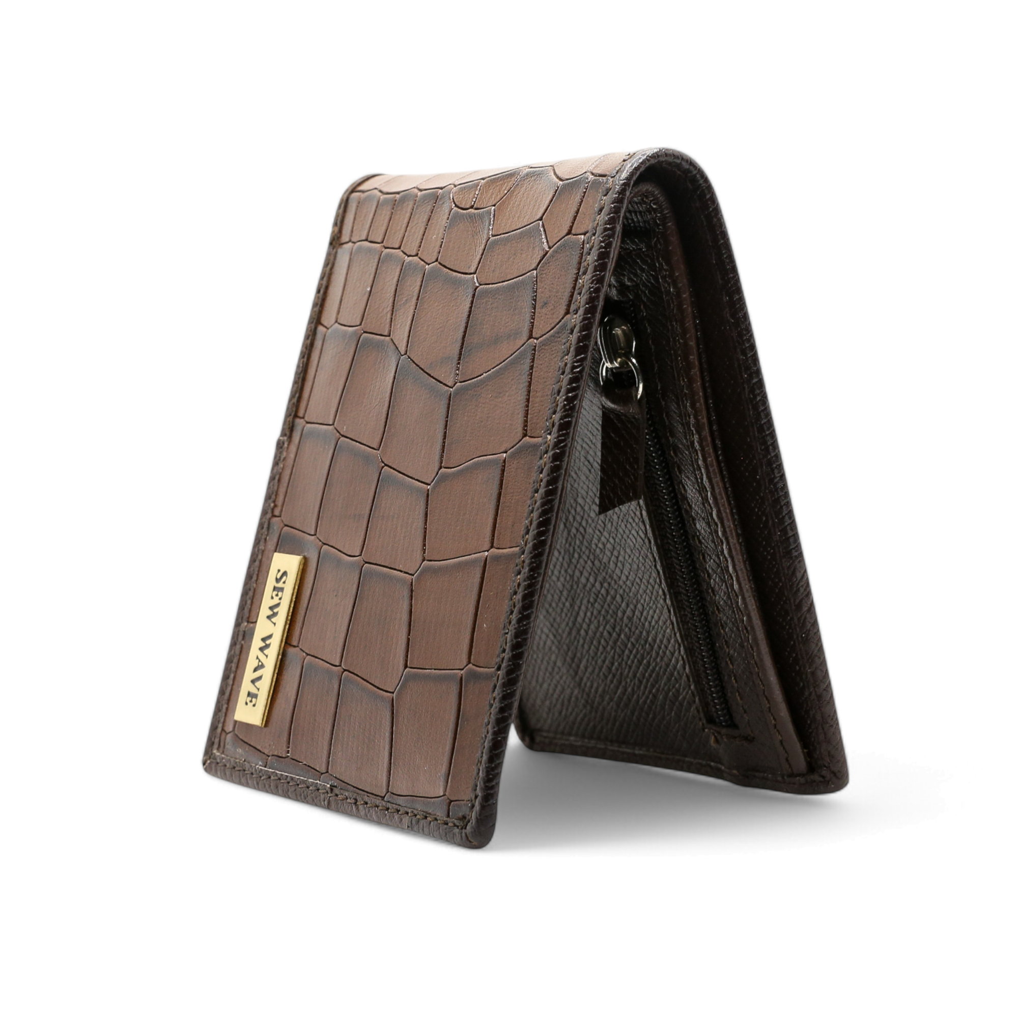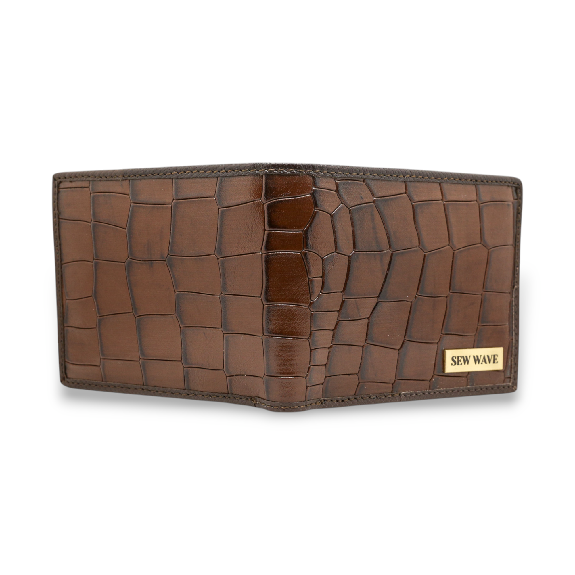 -Elevate your everyday style with this sophisticated men’s wallet. Crafted from premium leather, this wallet showcases an exquisite deep-cut crocodile pattern in a rich tan colour that exudes luxury and refinement. The burnished finish adds character and depth to the leather, making each piece uniquely distinctive. The meticulously detailed construction features precise stitching and a sleek gold-tone brand emblem that adds a touch of understated elegance. This wallet combines classic design with practical functionality, offering ample space for your essential cards and currency while maintaining a slim profile that fits comfortably in your pocket. The superior leather construction ensures durability for daily use, while the timeless aesthetic makes it a versatile accessory suitable for both formal and casual occasions. The warm tan shade complements any outfit, making this wallet an essential accessory for the modern gentleman who values both style and substance.